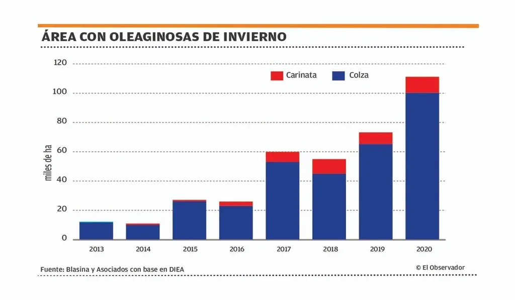 La colza pasó de 65.251 hectáreas en 2019 a 100.241 en 2020, ubicándose muy por encima de las 11.700 hectáreas sembradas en 2013 –unos de los primeros años de siembra comercial del cultivo–. Y en este año se le sumaron 11 mil hectáreas de carinata, un cultivo similar botánicamente, que aumentó el área un 38% en 2020, promovido por la finlandesa UPM como materia prima para la producción de biocombustibles y alimentación animal.