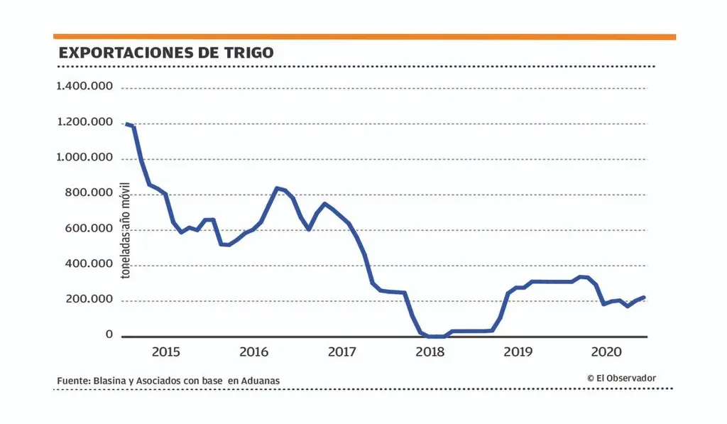 Considerando en 2020 un rendimiento de trigo 3.700 kilos por ha –desde un año flojo en la cosecha 2019 cuando el promedio nacional se ubicó en 3.270 kilos–, sobre 217 mil hectáreas la producción se ubicaría en 800 mil toneladas, permitiendo un excedente de unas 400 mil toneladas exportables.