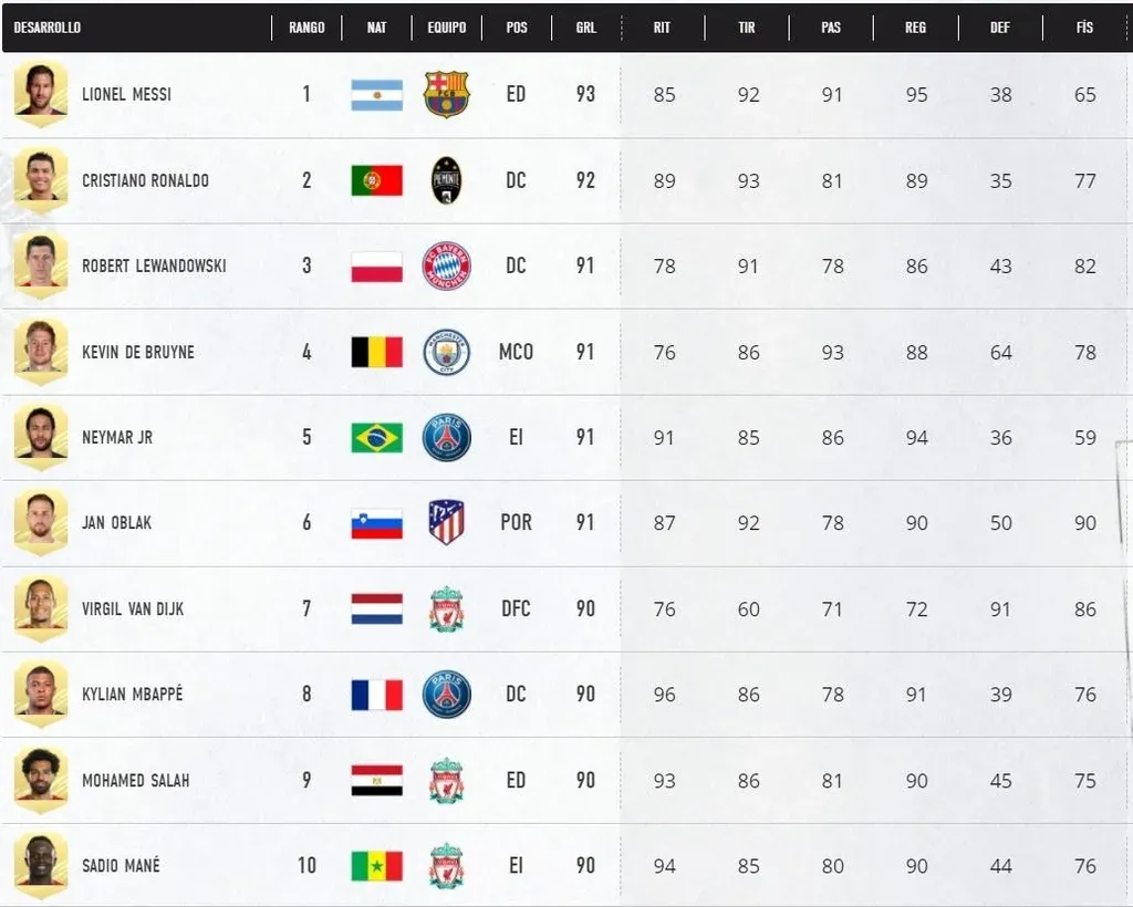 El mejor jugador del videojuego es Lionel Messi (93), seguido por Cristiano Ronaldo (92) y Robert Lewandowski (91). Esta es la lista: