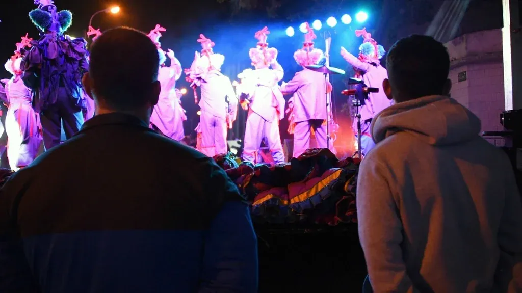 La murga hace tres tablados esa noche. Desde un escenario móvil en Buceo a Las Acacias y de ahí a La Unión. En cada uno el espectáculo es el mismo, pero las risas son otras. Los utileros saben cada coma del texto y cada arreglo del coro, cantan bajito cuando nadie los ve. Pero no hay que confundirse, están del lado que eligen.
