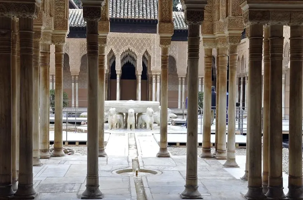 La restauración del conjunto se dará por concluida en dos meses con la pavimentación del suelo de mármol de Macael, cuando los turistas podrán pisar de nuevo el patio.