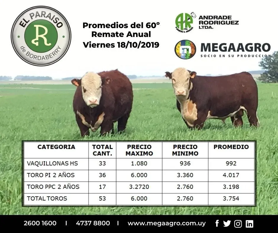Como viene ocurriendo en la mayor parte de los remates de esta zafra, el mercado absorbió toda la oferta Hereford y Polled Hereford presentada este viernes en el 60° remate anual de El Paraíso, de Bordaberry, en el local de la Sociedad Rural de Durazno.