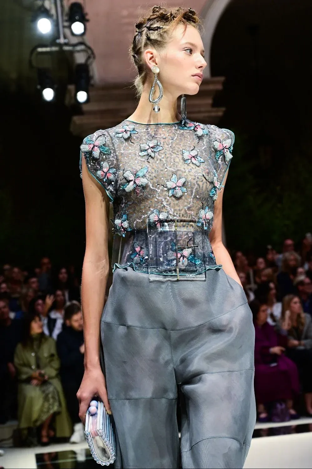 La fluidez, ese toque característico de la casa, se encarna en los tules, las organzas. Todo el calzado es plano, incluso para los vestidos de noche.