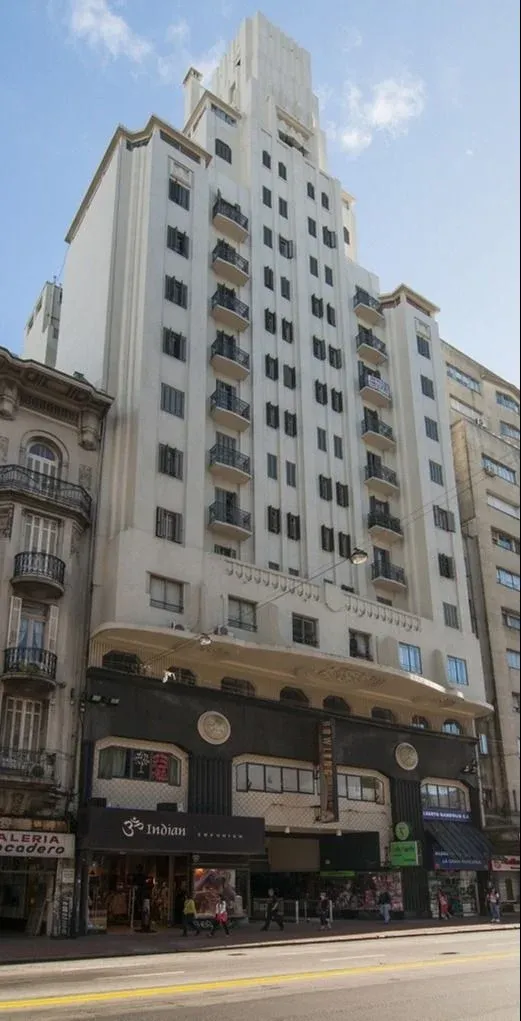 “El edificio se erige en el predio que ocupara La Giralda, famosa confitería donde unos años antes se estrena La Cumparsita. Allí los hermanos Salvo se proponen cumplir un programa inusual y complejo que combina hotel, galería comercial y oficinas. Y dan origen a un peculiar rascacielos que ofrece salón de baile, comedor, teatro, sala de billar, hotel y cientos de apartamentos.