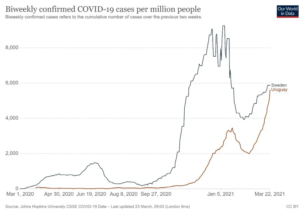 Pasadas las consecuencias sanitarias que ocasionaron las fiestas, Suecia contaba con 518 mil casos reportados al 24 de enero y aumentó a 744 mil (un 43%) casi dos meses después. Uruguay, en cambio, tenía 37 mil confirmados y subió a más de 81.500 el domingo, lo que deja un aumento del 116%.
