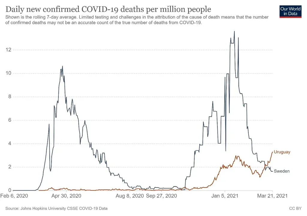 Suecia acumula 1.300 muertes por millón de habitantes, un número alto pero no entre los peores del mundo (Bélgica suma 1.900, Reino Unido 1.800, Italia 1.700 y EEUU 1.600). Uruguay está lejos de esa cifra, con 228 muertes por millón.