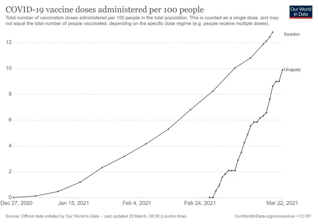 Las coincidencias entre Uruguay y Suecia también aparecen en el terreno de la vacunación. El primero administró, en la última semana, 0,45 dosis por cada 100 personas de la población total, según el sitio Our World in Data, y el segundo 0,28.