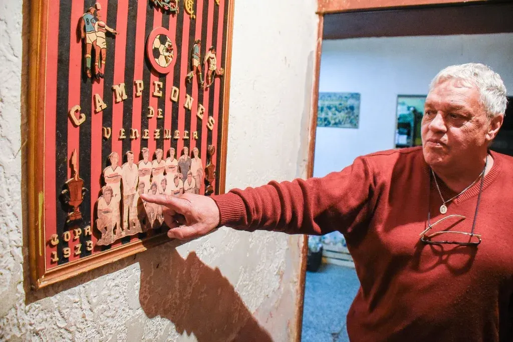 Camilo dos Santos Marcenaro señala un cuadro en el que se encuentra él cuando defendía a Portuguesa de Venezuela