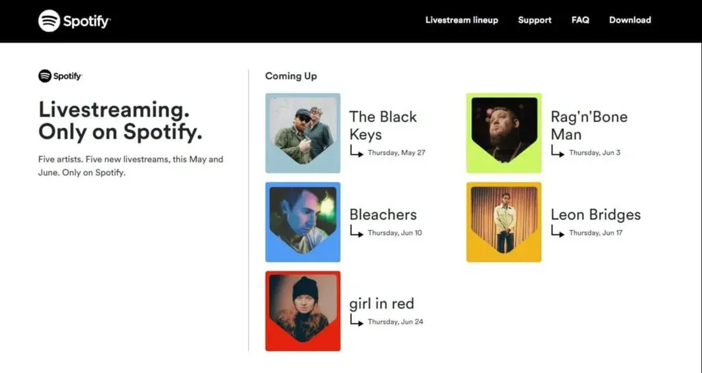 Conciertos por Spotify. La plataforma de música sigue reinventándose y ahora comenzó con los shows por streaming grabados en estudio o en las propias casas de los artistas. Así lo anunció en estos días: los tickets cuestan US$12, los conciertos duran entre 40 y 75 minutos y el primero lo dio The Black Keys. Ya está la lista hasta fines de junio.