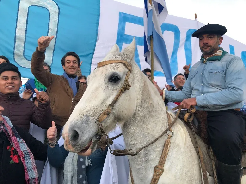 En un lugar ubicado en uno de los accesos a la ciudad por Ruta 15, la comitiva detuvo el paso para esperar la llegada de más militantes, mientras un hombre vestido con bombacha y boina intentaba dominar a un caballo mientras sostenía con su mano el pabellón nacional y la bandera celeste y blanca del partido al que Sartori se afilió hace pocos meses. En ese momento el empresario y su director de campaña bajaron del auto que los transportaba para saludar a ese militante con aspecto heroico, y tras de ellos fue un fotógrafo, un camarógrafo, al tiempo que gente del equipo de redes sacaba fotos desde su celular.