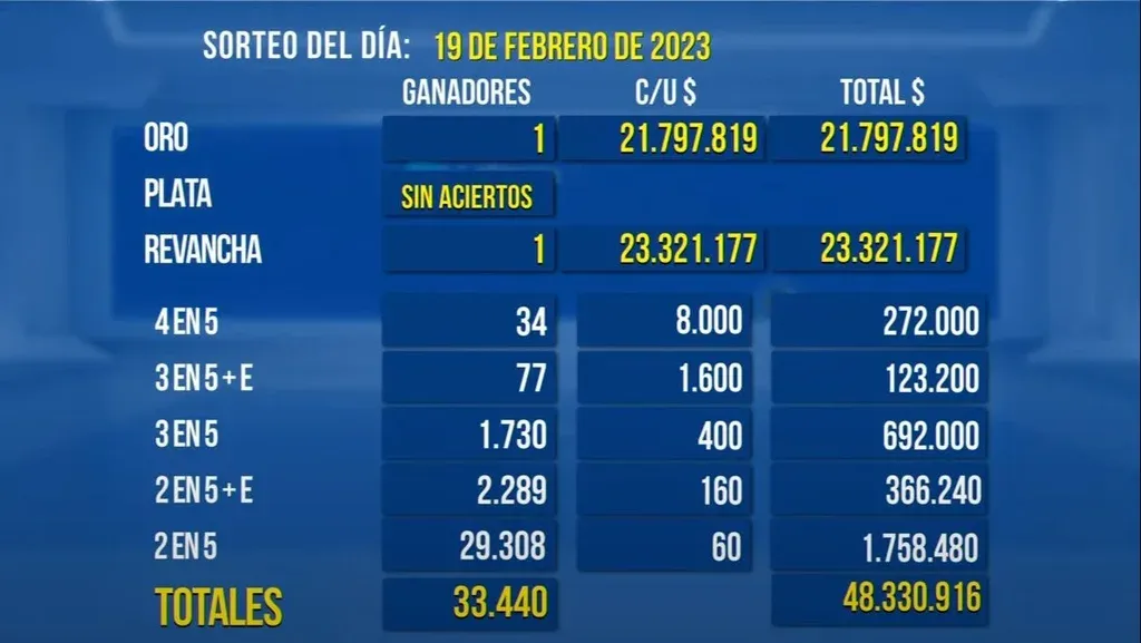 El 5 de Oro se volverá a jugar el próximo domingo 26 de febrero a las 22:00. Los premios ascenderán a $ 9,2 millones, de los cuales $ 5 millones corresponden al pozo de Oro y $ 4,2 millones al pozo Revancha.