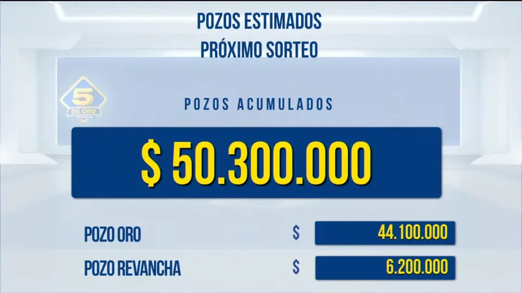 El acumulado del Pozo de Oro del 5 de Oro quedó en $ 44,1 millones para el próximo sorteo que se realizará el jueves 25 de mayo a las 22:00. Mientras tanto, el Revancha suma $ 6,2 millones. Esto suma $ 55,3 millones de pesos para el próximo sorteo.