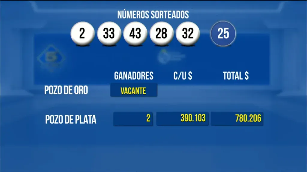 Este domingo 21 de mayo se celebró una nueva edición del sorteo del 5 de Oro. Los resultados determinaron que el Pozo de Oro, que acumulaba $ 36.711.796, quedara vacante; el Pozo de Plata con $ 780.206 tuvo dos aciertos, que se dividieron en montos de $ 390.103 y el Pozo Revancha, con una suma de $ 6.894.954 tuvo un acierto.