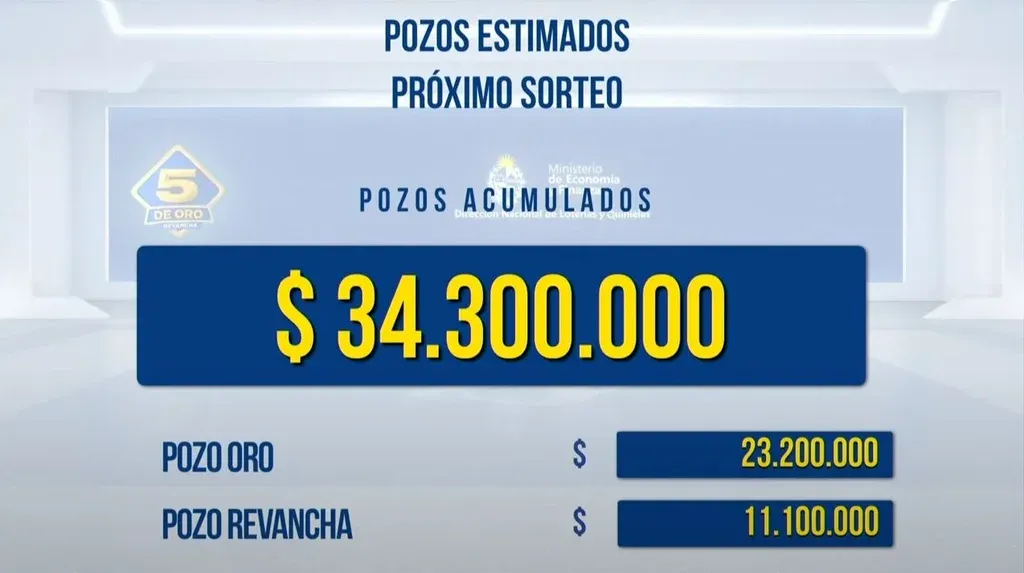 El acumulado del Pozo de Oro del 5 de Oro quedó en $ 23,2 millones para el próximo sorteo que se realizará el domingo 18 de junio a las 22:00. Mientras tanto, el Revancha suma $ 11,1 millones. Esto suma $ 34,3 de pesos para el próximo sorteo.