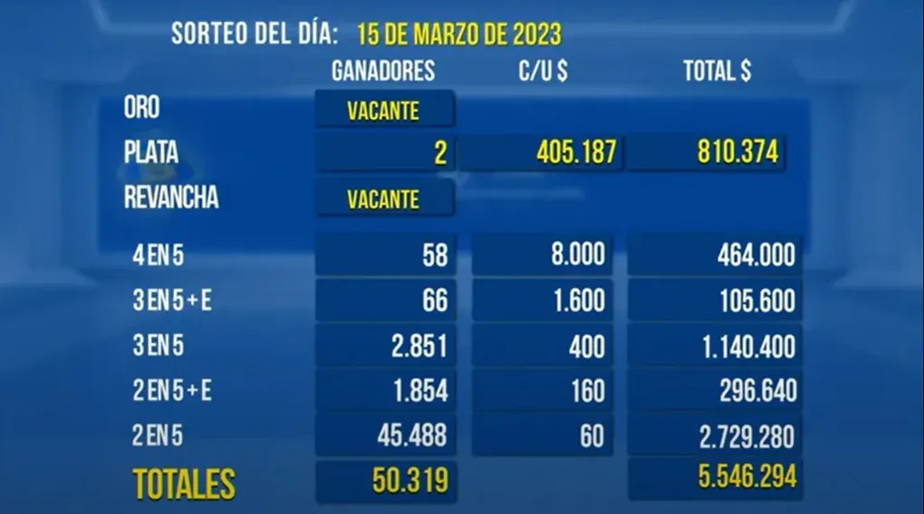 Con los resultados de este miércoles la edición del próximo domingo 19 de marzo acumulará premios por más de $ 118,8 millones, entre los $ 65.500.000 del pozo de oro y $ 53.300.000 del revancha.
