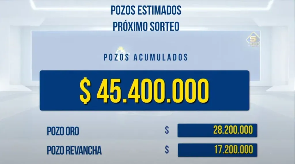 El acumulado del Pozo de Oro del 5 de Oro quedó en $ 28,2 millones para el próximo sorteo, que se realizará el miércoles 17 de mayo a las 22:00. Mientras tanto, el Revancha suma $ 17,2 millones. Hasta el momento el total estimado de premios para el próximo juego es de 45,4 millones de pesos.