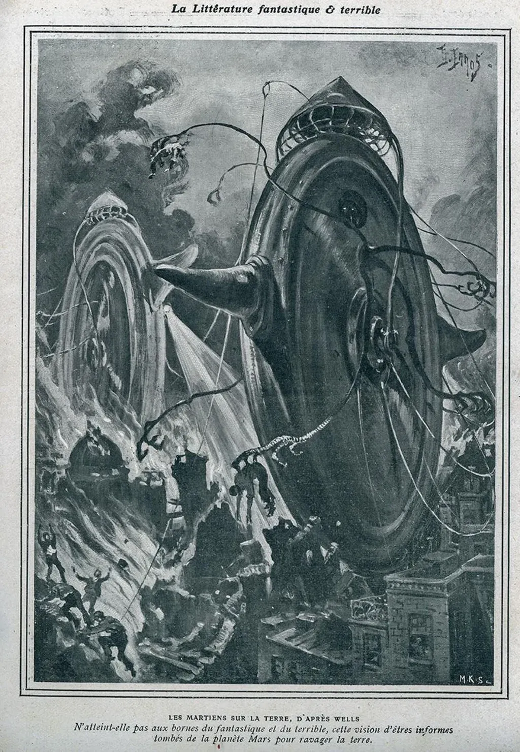 En 1898 publicó La guerra de los mundos, que describe una invasión marciana a la Tierra. Cuarenta años después de su publicación, en la noche de Halloween de 1938, la transmisión radiofónica de la novela en el Teatro Mercury por parte de Orson Welles provocó el pánico generalizado en la ciudad de Nueva York. Los marcianos de esta obra atacaban con lo que Wells llamó “rayo de calor”, una súper arma capaz de incinerar a humanos indefensos con apenas un destello de luz silencioso.