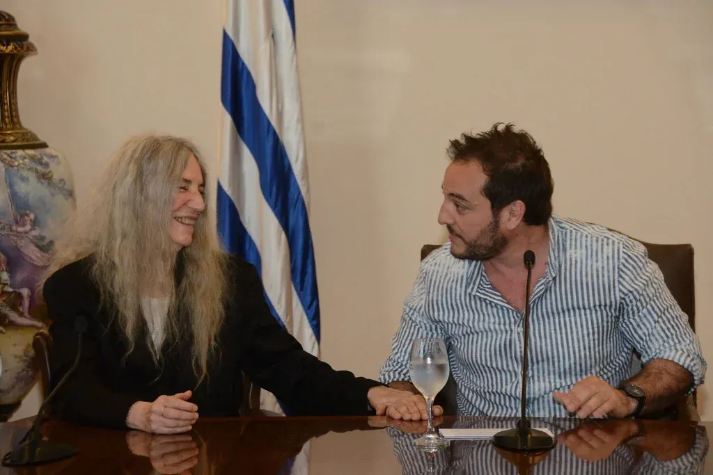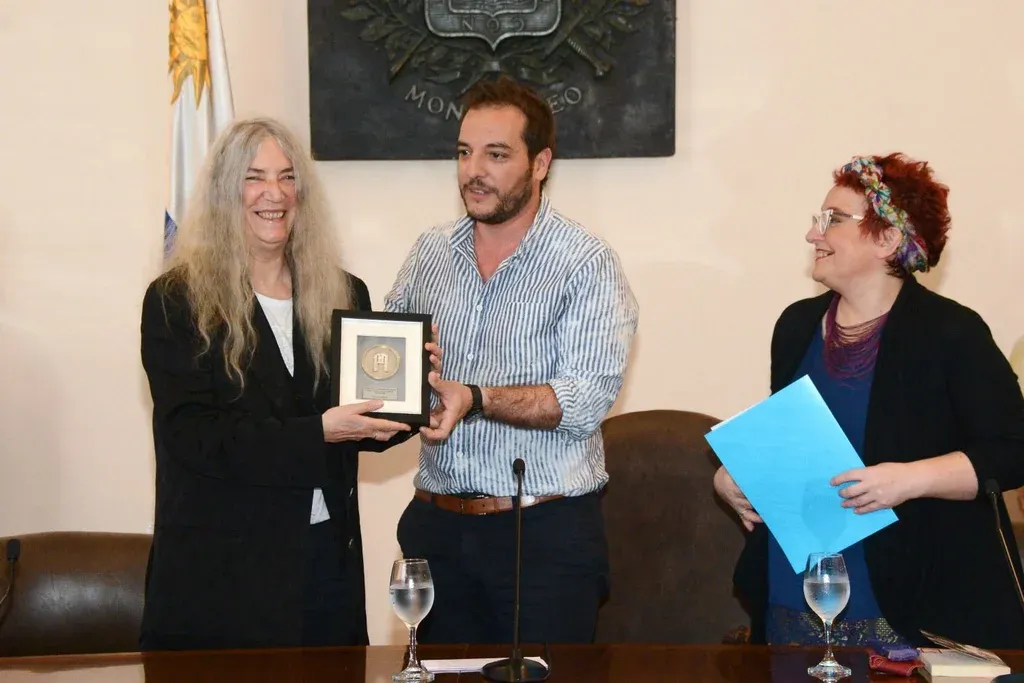 Diego Battiste Las ovaciones fueron reiteradas y estruendosas a lo largo de la breve conferencia, en la que el intendente resaltó la importancia de la visita de Smith a la ciudad. La calificó de "leyenda" y destacó la importancia de tener a una figura "que ayudó a rockear y a shockear". Por su parte, la directora de Cultura de la Intendencia, Mariana Percovich, contó que la cantante, poeta y activista se lleva como regalos los libros editados en inglés de Marosa di Giorgio, así como una selección de obras de otros poetas uruguayos.