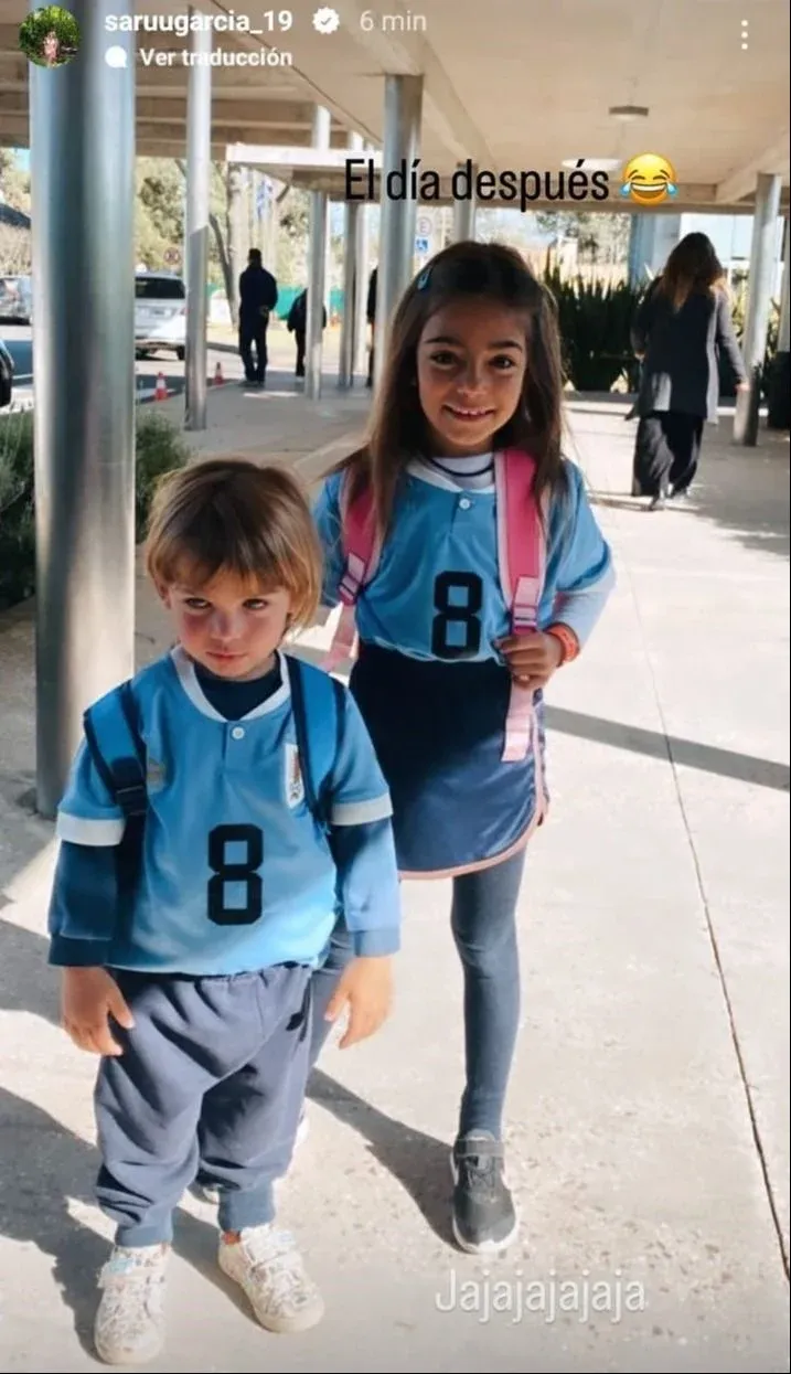 Los hijos de un jugador de la selección uruguaya fueron este miércoles a la escuela con las camisetas celestes con el nombre de su padre, luego de haber estado en el Estadio Centenario este martes en el triunfo ante Brasil por Eliminatorias.