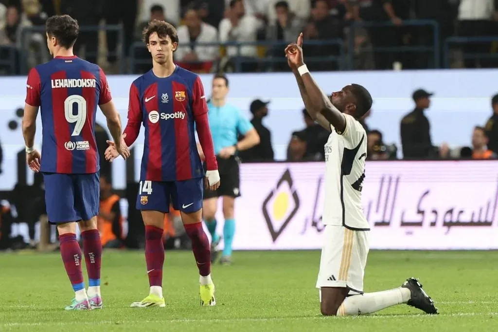 AFP Antonio Rudiger celebra la victoria del Real Madrid por la final de la Supercopa El defensor Ronald Araujo también comenzó como titular en Barcelona en el lateral derecho, pero se fue expulsado a los 70 minutos por doble amarilla. Además, sufrió como nunca el juego de Vinicius Jr., autor de tres goles y figura consular del partido.