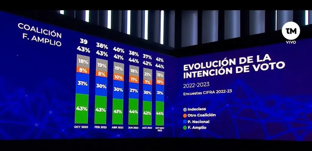 En la medición pasada, de agosto de este año, el FA recogía 42% de las adhesiones, el PN el 30%, otros partidos de la coalición 7% y los indecisos estaban en 21%. Esa encuesta anterior arrojaba un total de 42% para el FA y 37% para la coalición.