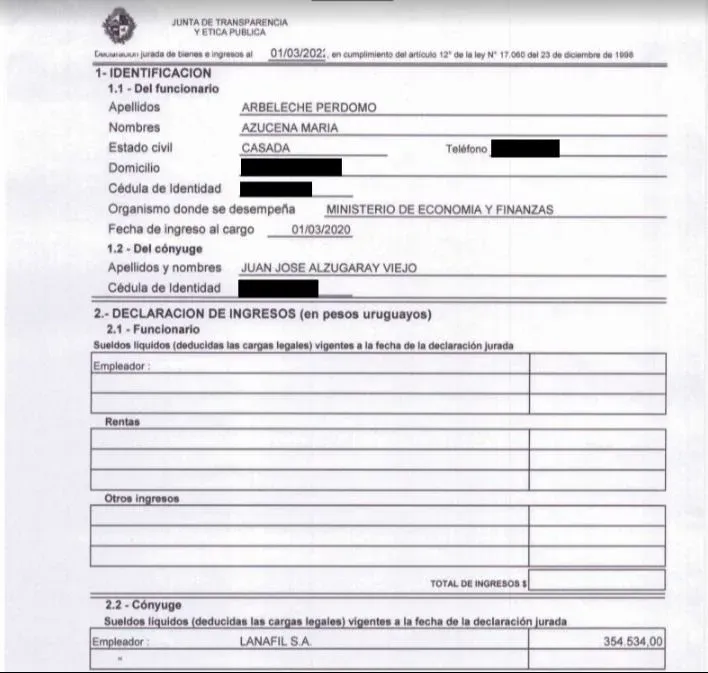 El mismo año en que el Ministerio de Economía decidió la exoneración parcial de impuesto, la declaración de la ministra Arbeleche (firmante de esa habilitación) dejaba constancia que su conyugue tenía un sueldo líquido de 354.534 pesos uruguayos como empleado de Lanafil S.A.
