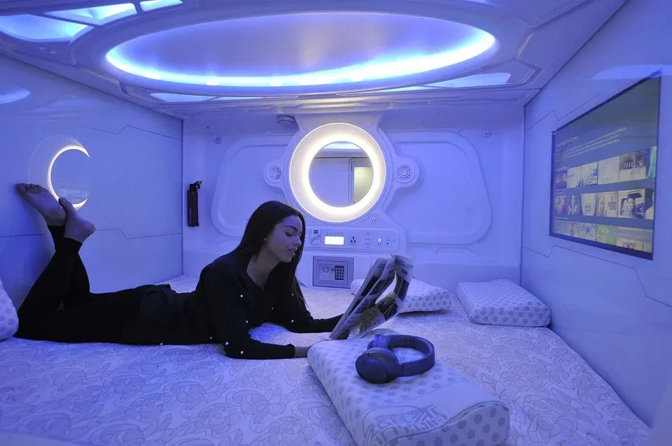 Las cápsulas del hotel, de aspecto absolutamente futurista, vienen equipadas con la última tecnología: conexiones USB, y bluetooth, renovación de aire opcional, pantalla de 26'' con contenidos streaming incluídos, acceso a internet, caja fuerte, conexión para auriculares, Leds para lectura graduables, despertador lumínico, espejo tocador con led regulable, termómetro digital, toma de corriente internacional, detector de humo, extintor de apoyo y opción de "no molestar", además de aplicaciones multimedia como Youtube, y juegos: "Nuestras estaciones de descanso, asegura Iñaki, están preparadas para albergar visitantes que quieran disfrutar del confort de una cama viscoelástica más amplia que las de la litera de un hostel, y con más privacidad ya que tiene puerta corredera con cierre electrónico y apertura con tarjeta que insonoriza el habitáculo. Somos como una especie de Hostel Premium".