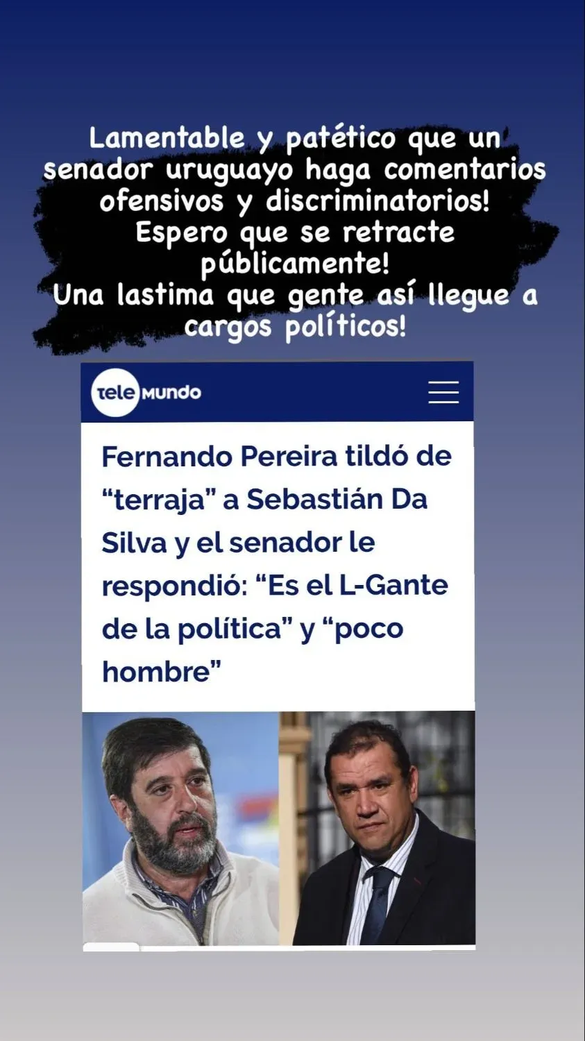 Ante esta situación, Cipolla se hizo eco de la noticia en su cuenta de Instagram y consideró "lamentable" y "patético" los "comentarios ofensivos y discriminatorios" de un "senador uruguayo".