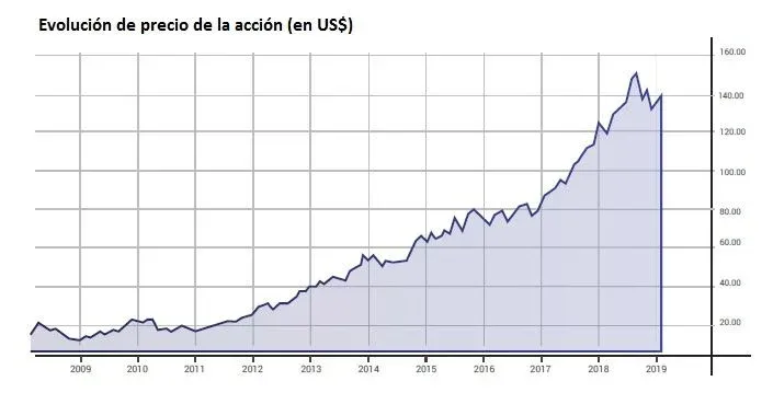 El precio de la acción alcanzó su máximo de US$ 150 en setiembre de 2018, desde donde rebotó hasta los US$ 120 afectado por las caídas generales. En ese período el precio había descendido por debajo de la media móvil de 52 semanas, lo que predecía una recuperación cercana.