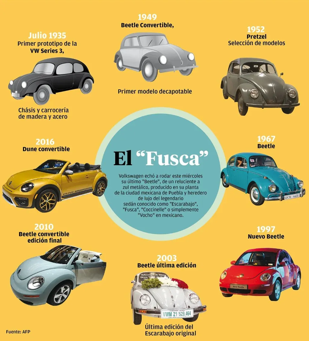 El Beetle fue heredero del legendario VW sedán, concebido en 1938 en Alemania en pleno auge del nazismo y que fue producido hasta 2003, saliendo el último modelo también de esta planta en México, donde el Fusca, como se le conoce popularmente, fue el auténtico auto del pueblo al ser "bueno, bonito y barato", como lo definen sus aficionados.
