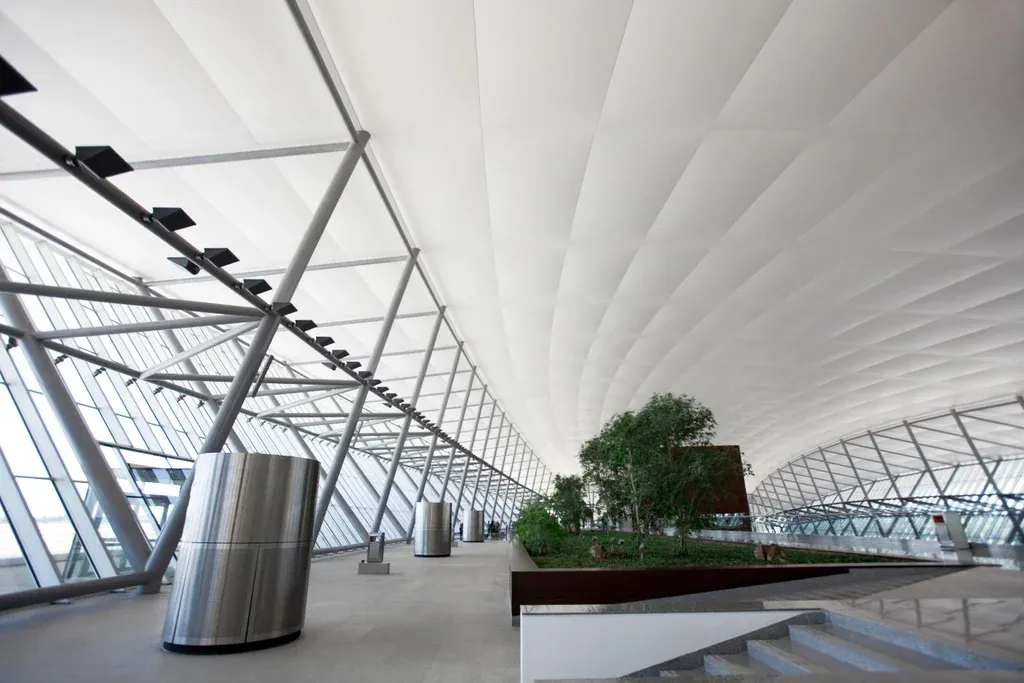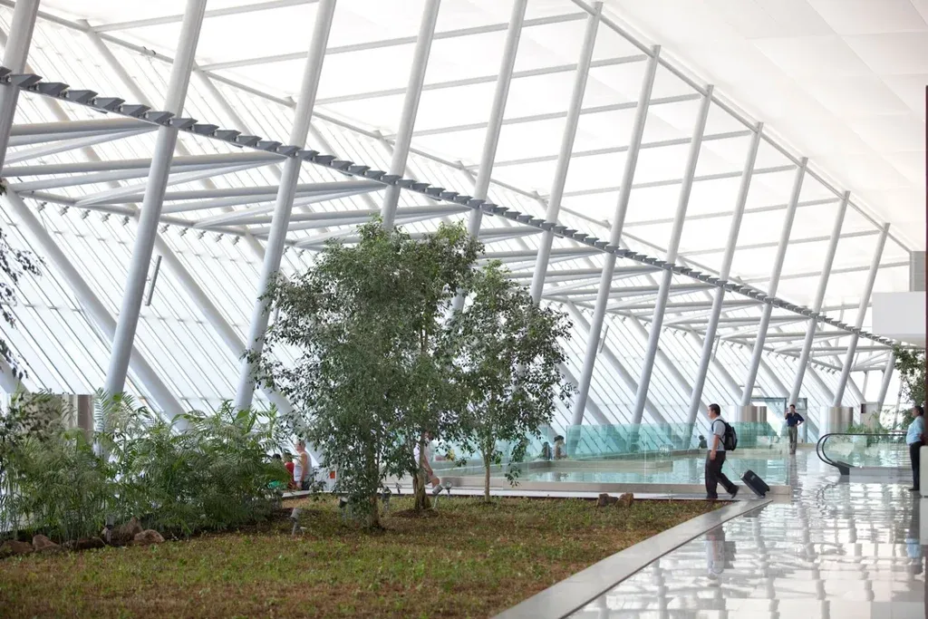 El hall principal, la enorme terraza ajardinada, las áreas de espera, los restaurantes, y las tiendas tienen gran presencia de luz natural, además de distintos sitios verdes y abiertos.
