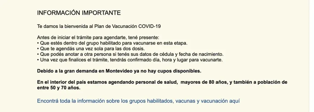 "Debido a la gran demanda en Montevideo ya no hay cupos disponibles", apunta la página web del Ministerio de Salud Pública (MSP). "En el interior del país estamos agendando personal de salud, mayores de 80 años y también a población de entre 50 y 70 años", dice.