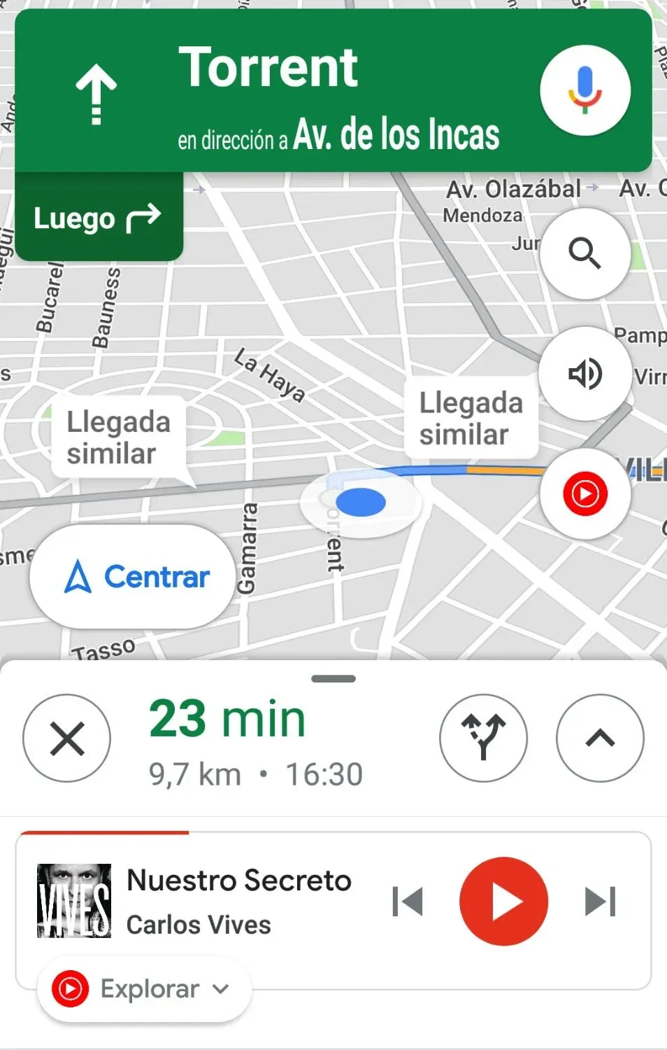 Una vez hecho eso, se vuelve a la pantalla del mapa, en donde ahora aparecerá el icono de YouTube Music. Al tocarlo, se verán los comandos de pista anterior, pista siguiente y reproducir/pausar.