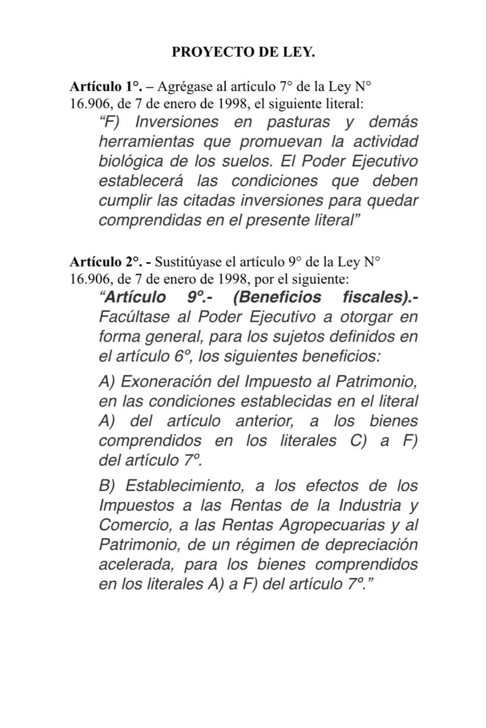 Con esta iniciativa lo que se busca es dar un salto exponencial en la productividad de los campos, ya que inversiones en praderas, verdeos y demás mejoras forrajeras estarán comprendidas en las exoneraciones del IRAE y del Impuesto al Patrimonio, así como instrumentos de fertilización orgánica, de incorporación biológica a los suelos que aseguran la sostenibilidad del sistema.