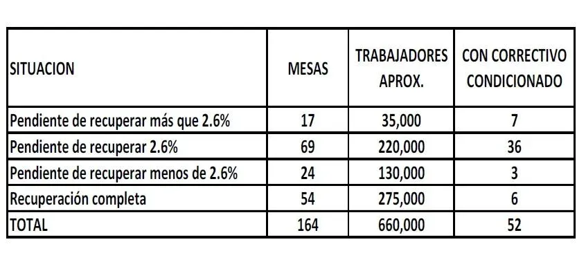Otro factor a tener en cuenta es que hay unas 50 mesas que tienen el correctivo final de inflación pasada condicionado a la evolución de cotizantes dentro de la actividad. Si esa clausula se activa, y solo se paga una parte del correctivo, la recuperación pendiente terminaría siendo mayor. Los correctivos estarían hoy entre 1,8% para los grupos que ya adelantaron un parte en 2022, y en 5,4% para los que no lo hicieron.