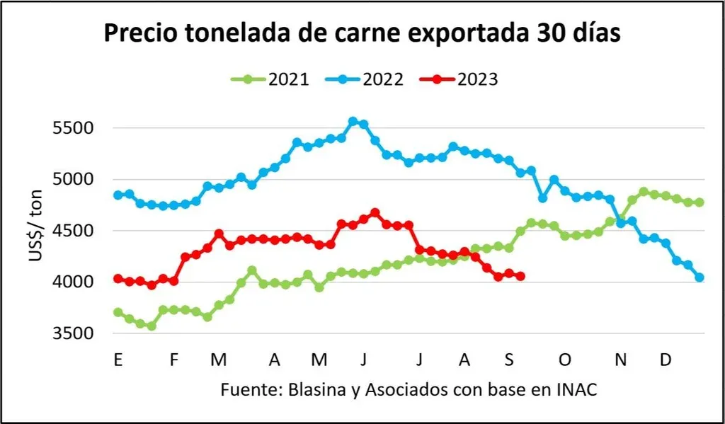 En agosto también hubo una recuperación del volumen de carne vacuna exportado, que por primera vez en el año creció respecto a igual mes de 2022. Lo que no aumenta es el precio de exportación. El último dato semanal publicado por el Instituto Nacional de Carnes (INAC) quedó por debajo de US$ 4.000 la tonelada exportada, en US$ 3.852 y confirma la flojedad en el mercado internacional para la carne vacuna. El Ingreso Medio de Exportación (IMEx) en agosto fue el más bajo desde diciembre del año pasado, con US$ 4.098 por tonelada.