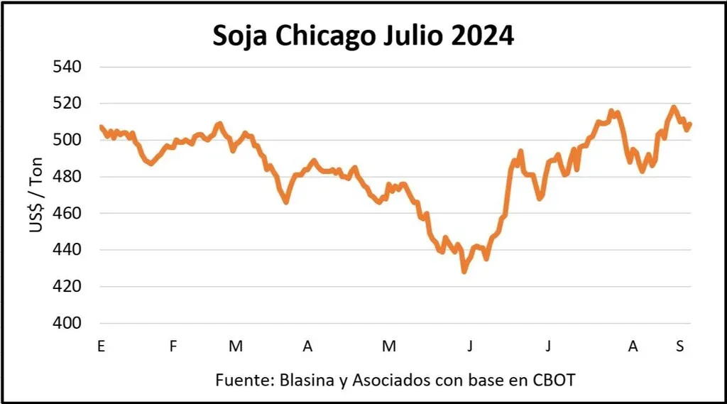 Este viernes la referencia para la soja de la cosecha 2024 cerró en Chicago a US$ 508 por tonelada y US$ 500 para la soja setiembre, con alzas limitadas por los sostenidos volúmenes que Brasil está poniendo en el mercado y la reactivación de ventas desde Argentina, en respuesta a un nuevo régimen de tipo de cambio para estimular a los productores.