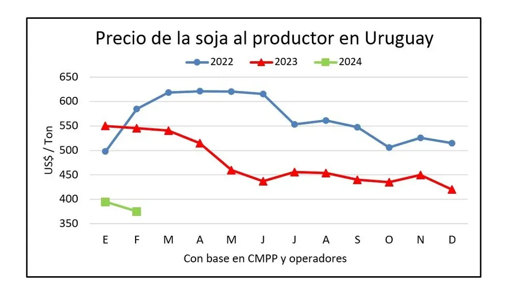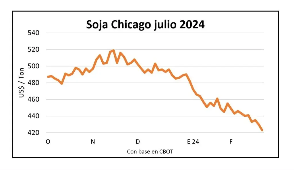 En su décima semana consecutiva de ajuste la soja cotiza a los valores de más bajos de los últimos 40 meses, desde noviembre de 2020: US$ 416/ton en la posición marzo y US$ 423 para julio, precio de referencia para Uruguay.