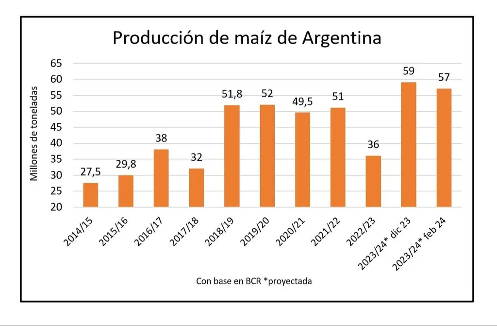 La estimación de la producción de maíz de Argentina fue corregida a la baja desde 59 a 57 millones de toneladas por la Bolsa de Comercio de Rosario. La Bolsa de Cereales de Buenos Aires mantuvo su estimación, ya menos optimista de 56,5 millones de toneladas.
