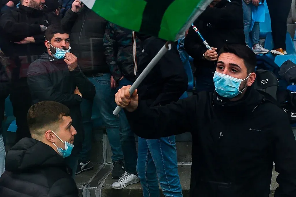 Hinchas de Lazio en el partido ante Genoa usando barbijo