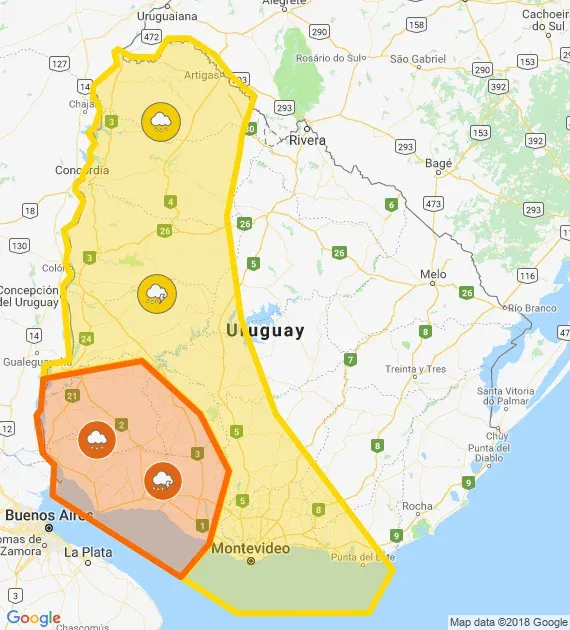 En tanto, los departamentos de Artigas, Salto, Paysandú, Río Negro, Canelones y Montevideo, así como las zonas este de San José y Flores, el oeste de Florida, y fragmentos de Maldonado, Lavalleja, Durazno y Tacuarembó, están bajo advertencia amarilla, también por tormentas intensas.