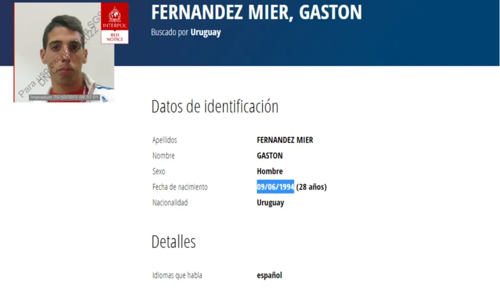 Interpol emitió una alerta roja contra Gastón Fernández Mier, quien fuera condenado por el homicidio de Hernán Fiorito, el hincha de Peñarol baleado en Santa Lucía mientras festejaba el aniversario 125 del club en 2016. El agresor fue condenado en 2021 junto a otros 15 hinchas de Nacional por el mismo hecho.