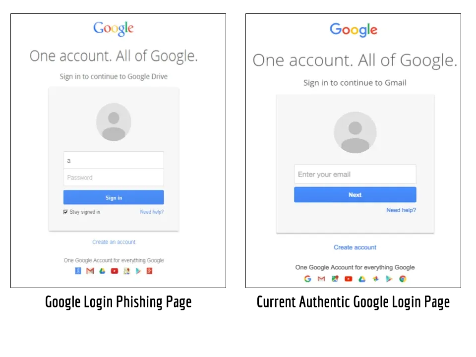 Para distinguir cuál es la real de la falsa hay que estar atento a los detalles, por ejemplo: el formato de inicio de sesión es diferente, en la real primero pide el mail y luego la contraseña, en la falsa las dos cosas a la vez. En la falsa el logo de Google está desactualizado y lo mismo sucede con los íconos de la parte inferior. Hay texto originalmente en negritas que no aparece en la original.