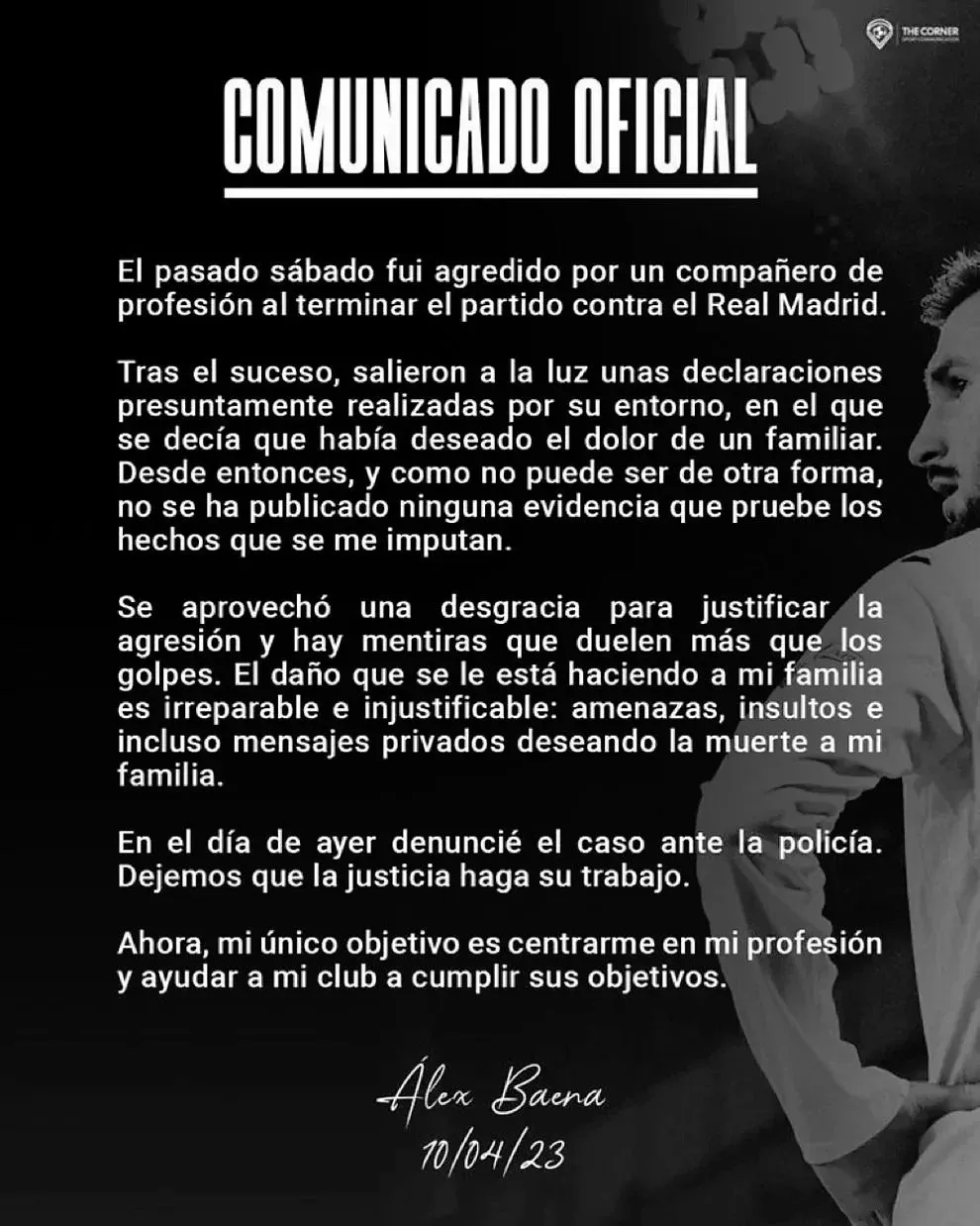 "El pasado sábado fui agredido por un compañero de profesión al terminar el partido contra Real Madrid. Tras el suceso, salieron a la luz unas declaraciones presuntamente realizadas por su entorno, en el que se decía que había deseado el dolor de un familiar. Desde entonces, y como no puede ser de otra forma, no se ha publicado ninguna evidencia que pruebe los hechos que se me imputan".