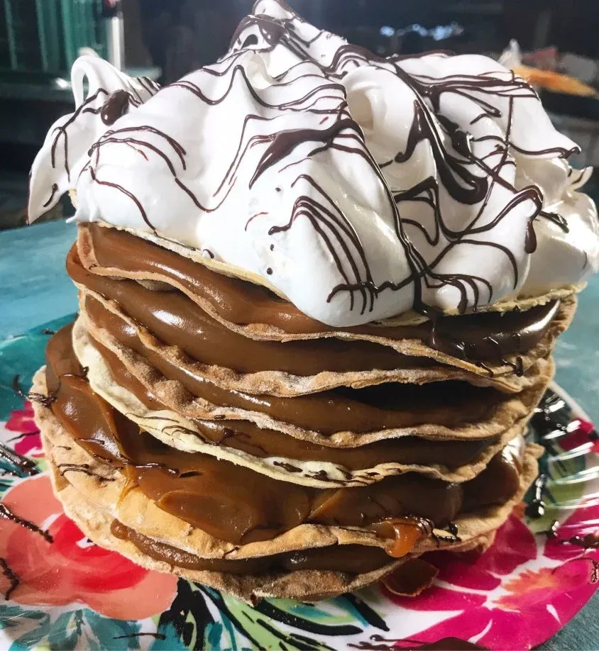 –Sacar del horno y dejar enfriar. Intercalar las 8 capas de masa con capas de dulce de leche repostero.
