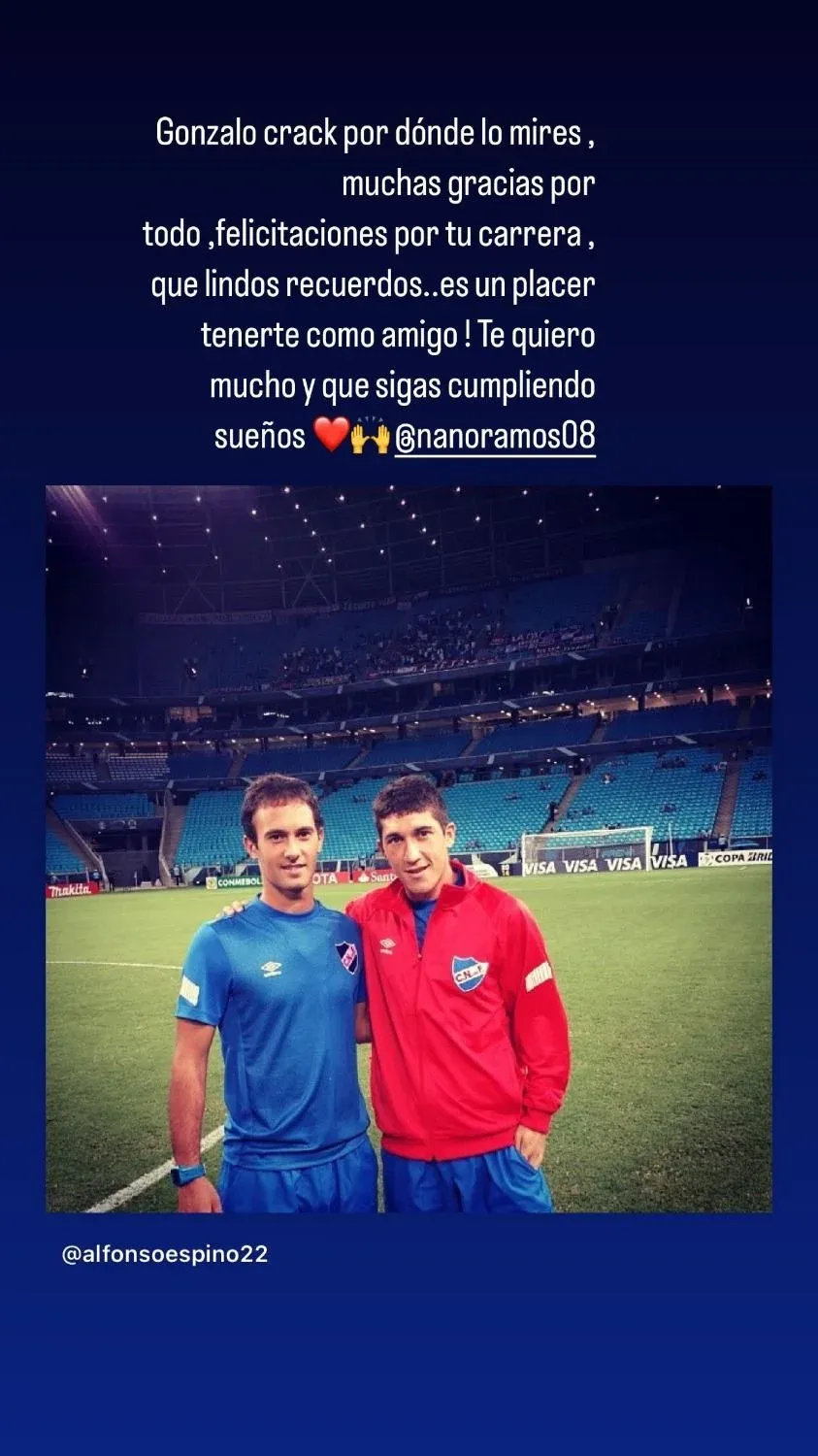 "Gonzalo crack por dónde lo mires, muchas gracias por todo, felicitaciones por tu carrera. Qué lindos recuerdos, es un placer tenerte como amigo. Te quiero mucho y que sigas cumpliendo sueños", escribió Espino para su amigo Gonzalo "Nano" Ramos.