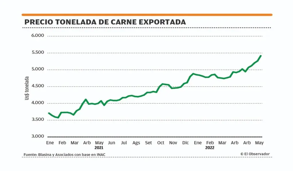 En los primeros cuatro meses de este año el precio de la tonelada de carne vacuna exportada está 30% arriba: US$ 5.018 frente a US$ 3.864 de 2021. En comparación al precio del novillo aumentó 8 puntos menos. El precio de los últimos 30 días se ubica en US$ 5.400, un récord absoluto.