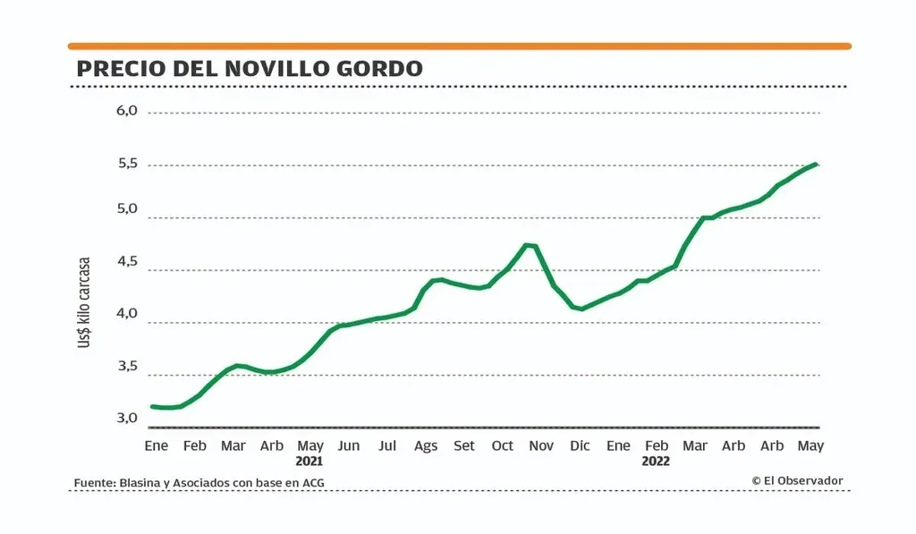 El novillo gordo nunca había valido más de US$ 5 por kilo de carcasa, barrera que cruzó velozmente y ha alcanzado los US$ 5,50. Aunque pierda un dólar por kilo, lo que sería un ajuste muy importante, se mantendría un buen precio para los productores.