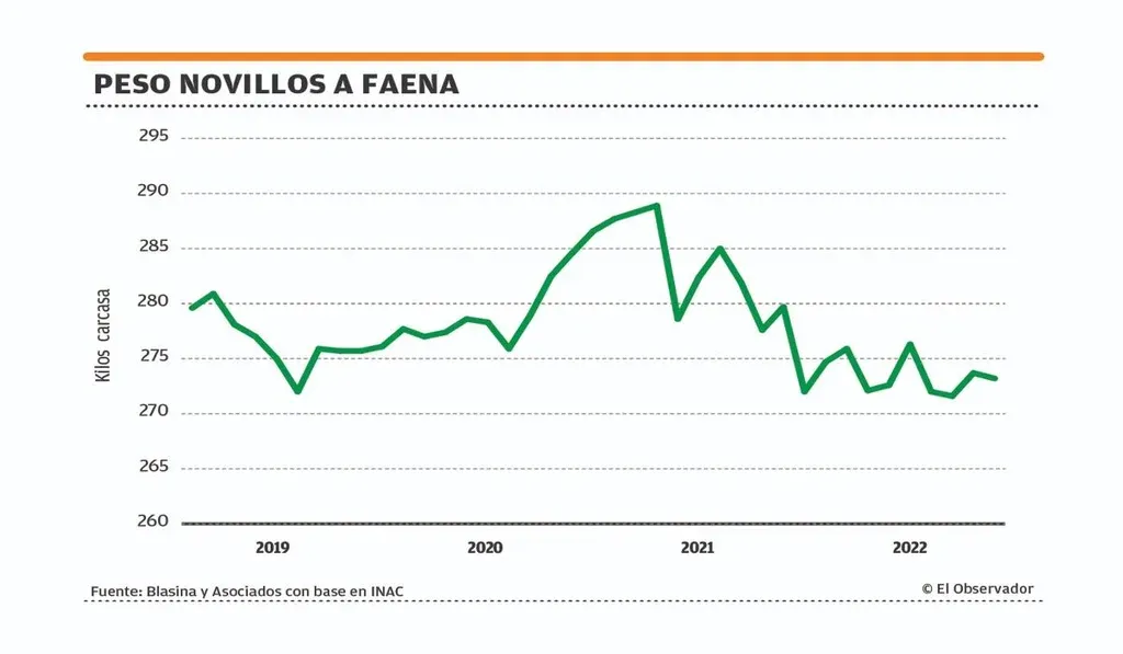 En el primer cuatrimestre de 2021 el peso promedio de los novillos fue de 281,7 kilos en cuarta balanza. Y un año después el promedio ha bajado 9 kilos, hasta 272,8 kilos. Las vaquillonas bajaron 8 kilos en promedio, de 225 a 217; y las vacas bajaron 5 kilos, de 231 a 226 al gancho.