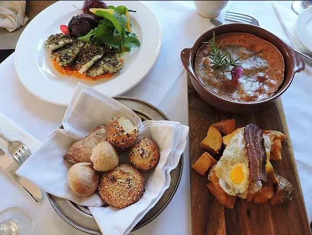 La carta incluye algunos platos de cocción lenta como el pastel de carne cocinado en cerveza durante seis horas con laurel y romero, envuelvo en una masa crocante que conserva todos sus aromas. Entre las entradas encontramos tablas originales, como la mezze que incluye dips de hummus, berenjena, yogur y pepino, somosa y crocante de cúrcuma, o la española, con shot de gazpacho, tortilla y focaccia. Entre los principales destaca la pesca del día con costra de hierbas, limón y remolacha escrachada, el curry de carrasco protagonizado por pollo de campo, chutney, arroz aumati y popadom y el bife ancho con tomate confitado y papa escrachada.